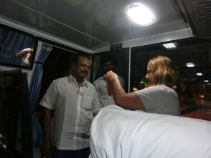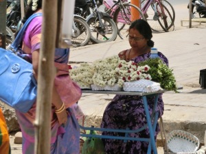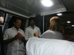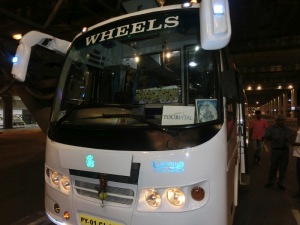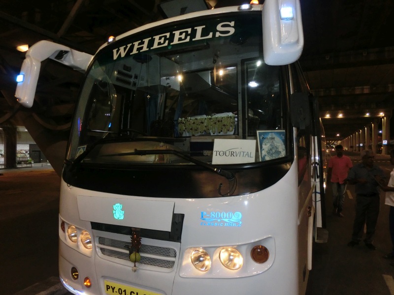 Vor dem Flughafen wurden wir bereits mit einer Jasmin Blumenkette von unserem Reiseleiter Ravi erwartet. Unser Bus, der uns auf dieser gesamten Rundreise begleiten soll, wartete vor dem Flughafen.