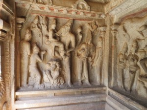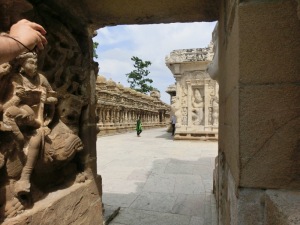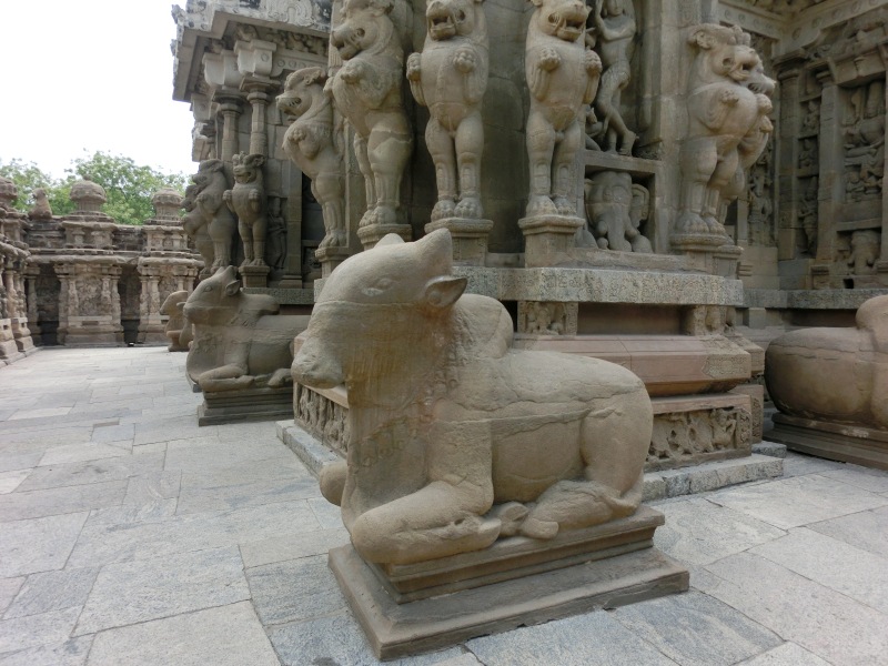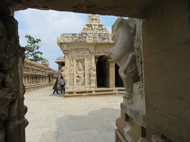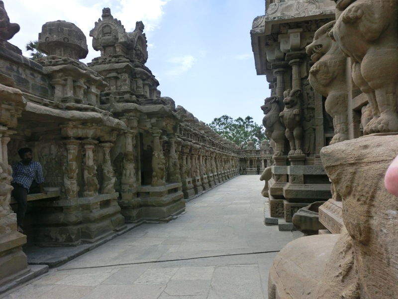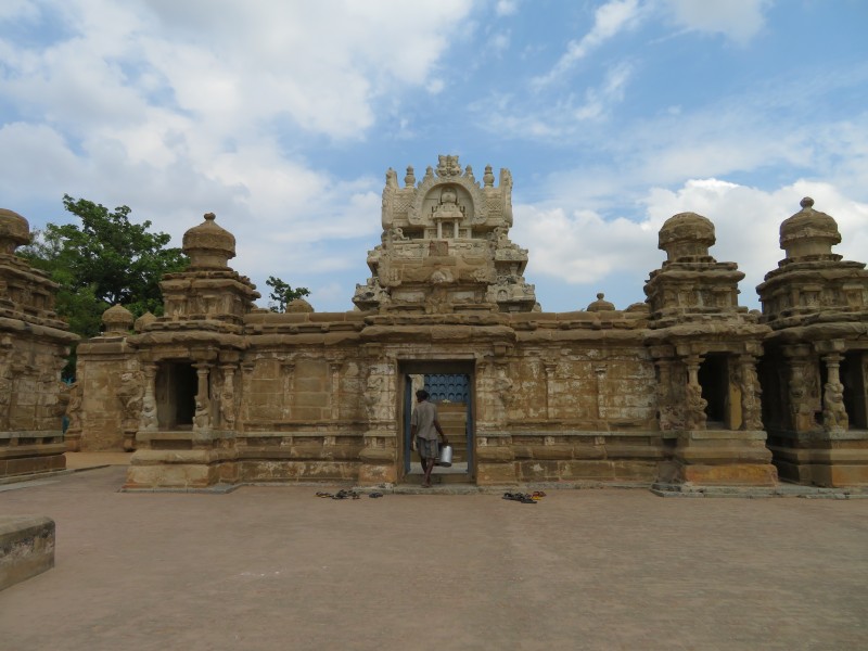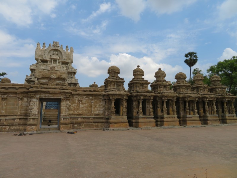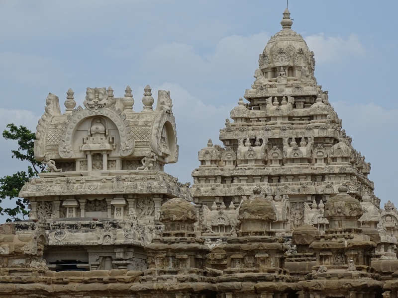 Kailasanatha-Tempel: Quelle: Wikipedia „Der älteste aller noch erhaltenen Tempel, der überwiegend aus Sandstein bestehende Kailasanatha-Tempel zu Ehren Shivas (tam. Sivan), wurde gegen Ende des 7. Jahrhunderts unter Weiterentwicklung der Mamallapuram-Architektur erbaut. Bis heute hat er kaum bauliche Veränderungen erfahren und gilt daher als eines der herausragendsten Beispiele der frühen hinduistischen Tempelbaukunst im südindischen Dravida-Stil, in dem unter anderem Wandmalereien aus der Erbauungszeit erhalten blieben. Um das nach Osten hin geöffnete zentrale Heiligtum, das von einem vierstöckigen Vimana (Tempelturm) überragt wird, sind sieben kleinere Schreine angeordnet, die ebenfalls von kleinen Türmen bekrönt werden. östlich schließt sich eine ursprünglich freistehende Pfeilerhalle (Mandapa) an, die wahrscheinlich erst im 14. Jahrhundert durch eine weitere Halle mit dem eigentlichen Tempel verbunden wurde. In die rechtwinklige Umgebungsmauer des Tempelkomplexes sind zahlreiche kleine Zellen mit Vimanas eingelassen. über dem östlichen Eingangstor erhebt sich ein Turm, der bereits Merkmale der späteren, prachtvoll ausgestalteten Gopurams aufweist“.