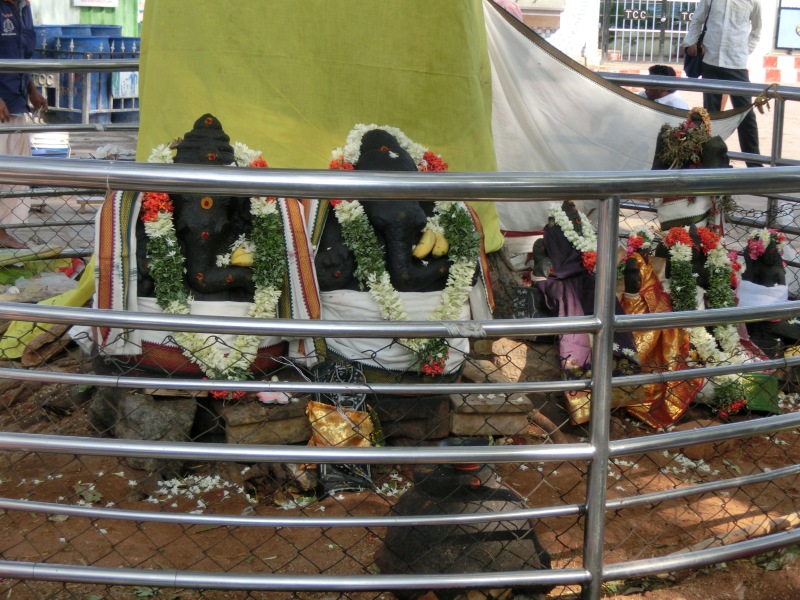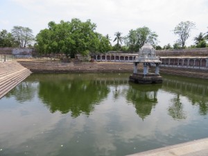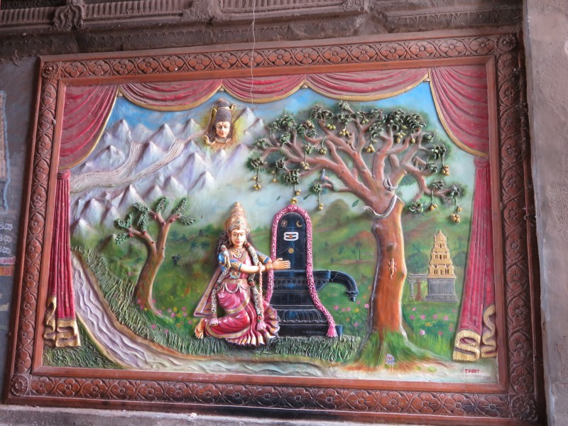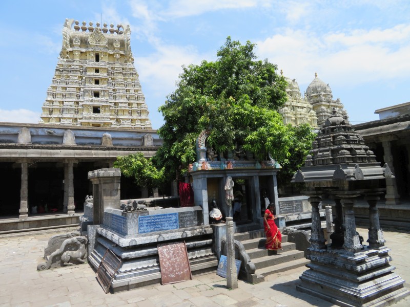 Ekambaresvara-Tempel: Quelle: Wikipedia „Der größte Tempel Kanchipurams stammt aus der Vijayanagar-Epoche. Er wurde 1509 zu Ehren Shivas um einen heiligen Mangobaum erbaut. Der 58 Meter hohe Gopuram über dem Süd Tor ist typisch für die spätere Dravida-Architektur. Das eigentliche Heiligtum liegt in einem der fünf Innenhöfe des Komplexes und umfasst zwei Vorhallen. Auf dem mehrere Hektar großen Gelände befinden sich zahlreiche kleinere Schreine sowie zwei Teiche.“