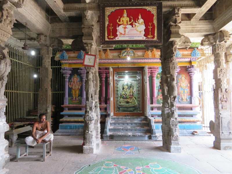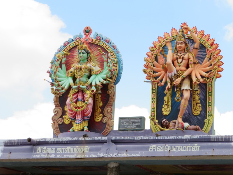 Quelle Wikipedia: „Der Nataraja-Tempel (auch Sabhanayaka-Tempel) ist ein Hindu-Tempel in der Stadt Chidambaram im südindischen Bundesstaat Tamil Nadu. Er ist Nataraja, einer Erscheinungsform des Gottes Shiva, geweiht. Als Ort, an welchem dem Mythos zufolge Shiva als „König des Tanzes“ seinen kosmischen Tanz vollführt haben soll, gehört der Nataraja-Tempel zu den wichtigsten shivaitischen Heiligtümern Indiens. Chidambaram scheint bereits früh ein religiöses Zentrum gewesen zu sein und wird ab dem 7. Jahrhundert in der Dichtung erwähnt. In seiner heutigen Form stammt der Nataraja-Tempel im Wesentlichen aus der Spätzeit der Chola-Dynastie (11. –13. Jahrhundert) mit einigen Zusätzen aus der Pandya- und Vijayanagar-Zeit (13. –16. Jahrhundert). Der Nataraja-Tempel ist ein hervorragendes Beispiel der dravidischen Tempelarchitektur. Wie es für diesen Baustil kennzeichnend ist, hat der Tempel einen rechteckigen Grundriss und ist nach geometrischen Prinzipien aufgebaut. Der mit über 15 Hektar sehr weitläufige Tempelkomplex besteht aus vier konzentrischen Bereichen, die um den dem Gott Nataraja geweihten Hauptschrein herum aufgebaut sind. Daneben gehören zu dem Tempelkomplex zahlreiche weitere Bauteile, darunter Nebenschreine, mehrere große Tempelhallen, ein Tempelteich und vier hoch aufragende Gopurams (Tortürme)“.