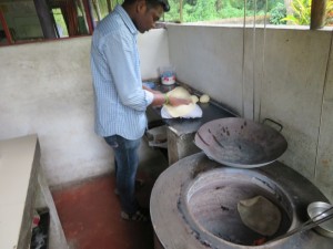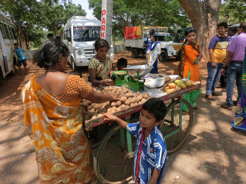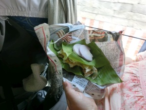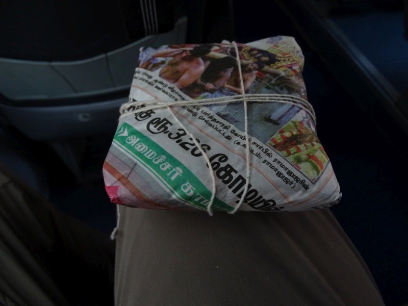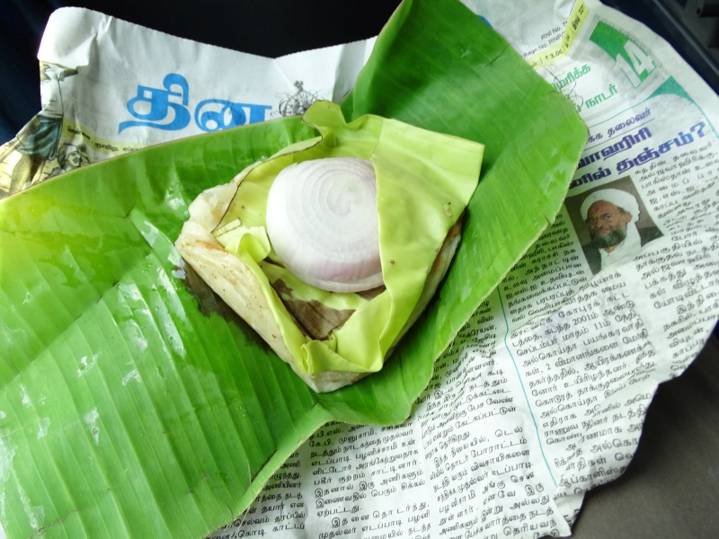 Da uns ein leichter Hunger plagte, besorgte uns Ravi etwas zu Essen. In einer Zeitung eingewickelt und zugebunden gab es ein traditionelles indisches Essen. In einem Bananenblatt gebacken, befand sich ein Fladenbrot mit Zwiebeln. Hat echt gut geschmeckt.