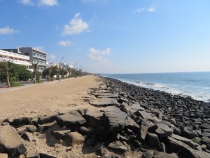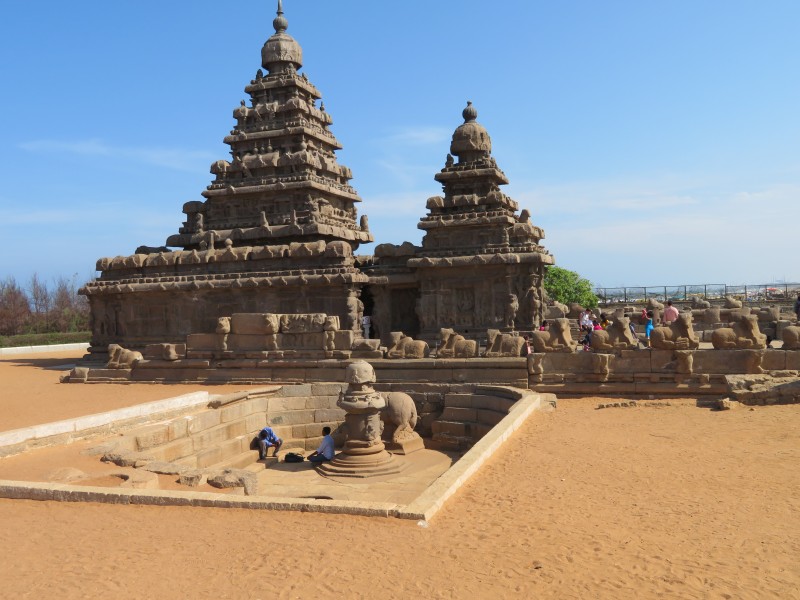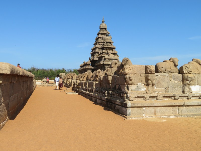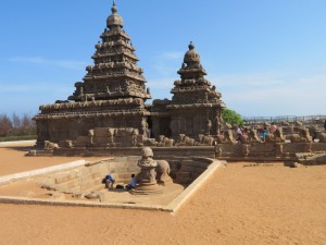 Der Küstentempel: Der Küstentempel (Shore Temple) von Mamallapuram befindet sich direkt am Strand von Mamallapuram. Ende des 8. Jahrhunderts unter dem Pallava-König Rajasimha Narasimhavarman II. erbaut, gehört er zu den ältesten Steintempeln in Südindien. Mit seinem Tempelturm (Vimana), der sich über dem Heiligtum erhebt, war er prägend für die Entwicklung des Dravida-Stils. In seinem Inneren beherbergt der Tempel einen dem Gott Shiva geweihten Schrein mit einem Linga sowie einen Nebenschrein für den Gott Vishnu, der hier auf der mythischen Schlange Ananta ruhend dargestellt ist. Den überlieferungen zufolge ist der Küstentempel der einzige, erhalten gebliebene aus einem Komplex von sieben Tempeln. Der Komplex soll sich über zehn Kilometer entlang der Küste erstreckt haben. Der Tempel, der zwölf Jahrhunderte an seinem küstennahen Standort überdauert hat, wird inzwischen durch eine Einfriedung sowie Wellenbrechern aus Felsbrocken vor der Erosion geschützt. Diese durch die Regierung Indira Gandhis errichteten Blöcke ließen den Tempel den Tsunami vom 26. Dezember 2004 überstehen.