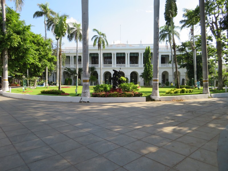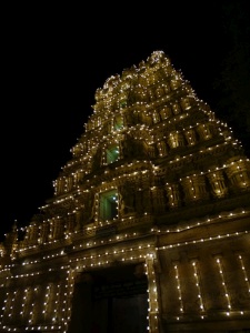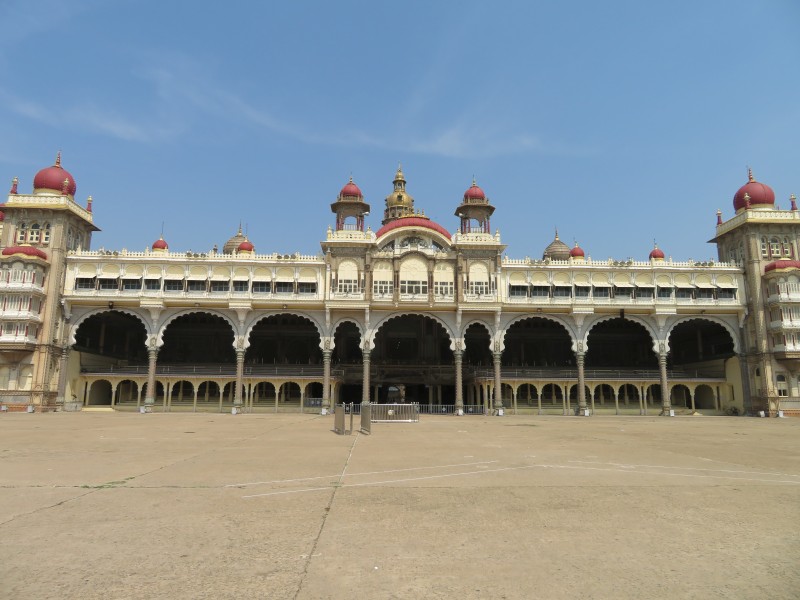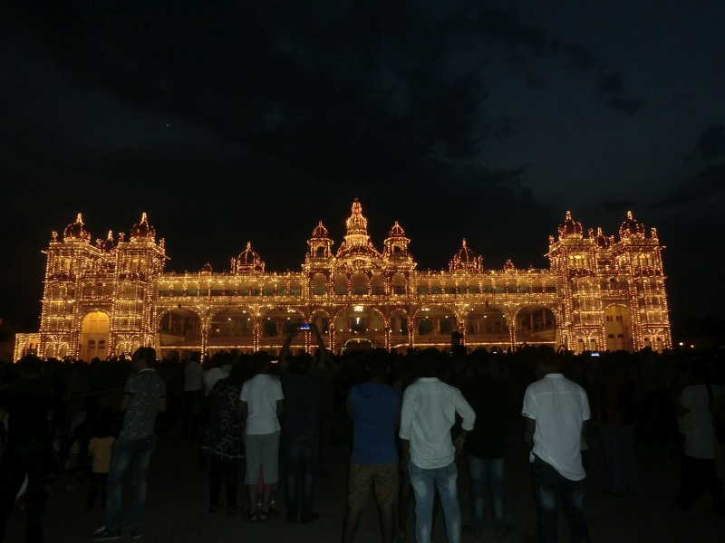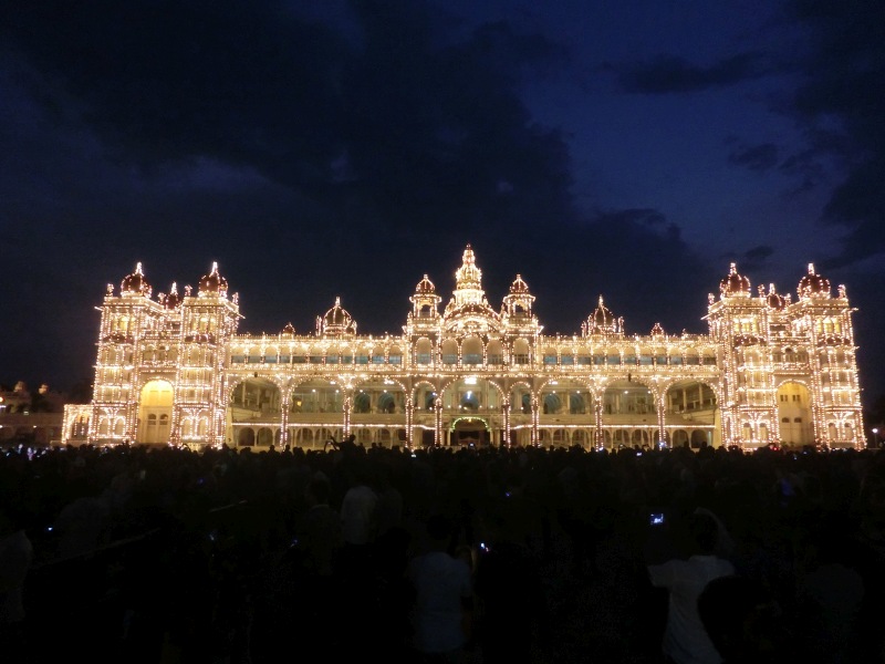 Amba Vilas: Quelle Wikipedia: „Amba Vilas ist ein Palast im Zentrum der Stadt Mysore im südindischen Bundesstaat Karnataka. Er war Residenz der Maharajas des ehemaligen Fürstenstaates Mysore, deren Nachfahren noch heute einen Teil des Palastes bewohnen. Der Palast zählt zu den berühmtesten Palastbauten ganz Indiens. 1897 bis 1912 wurde Amba Vilas für über vier Millionen Rupien nach Entwürfen des britischen Architekten Henry Irwin erbaut. Der prächtige indo-sarazenische Bau ersetzte den kurz zuvor abgebrannten alten Palast. Sein Grundriss erinnert an den Grundriss des Buckingham Palace in London. Er vereint Elemente der traditionellen hinduistischen, indisch-islamischen, rajputischen und europäischen Architektur.