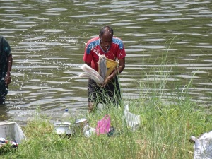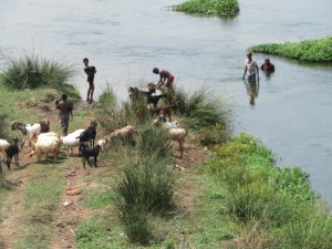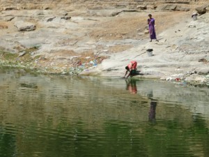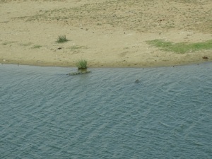 Entlang an fast völlig ausgetrockneten Seen, entdeckten wir sogar Krokodile. Aber auch Menschen badeten darin. Wer wohl schneller schwimmen kann?
