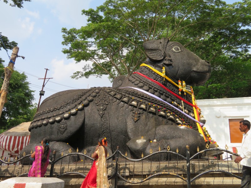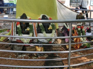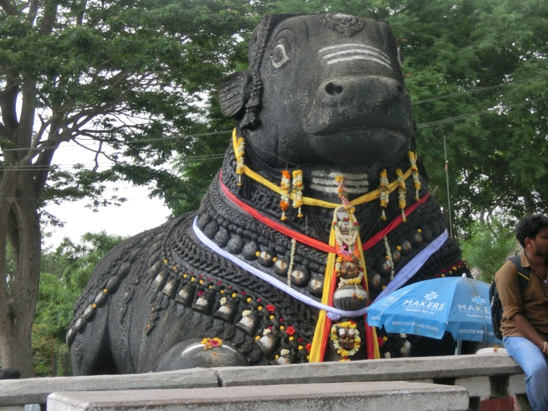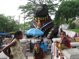 Auf dem Hügel angekommen, sahen wir schon das riesige schwarze Reittier von der Gottheit Shiva. Innerhalb dieses Heiligtums mussten natürlich wieder die Schuhe ausgezogen werde.