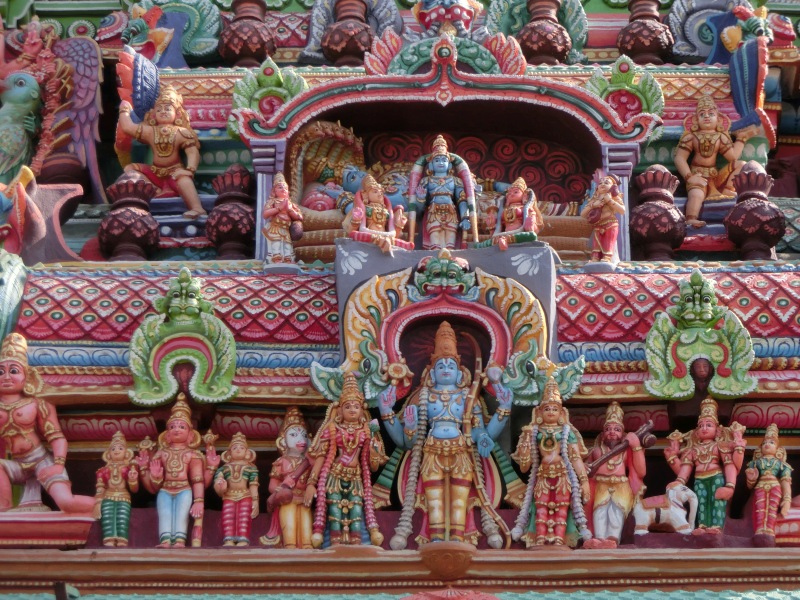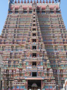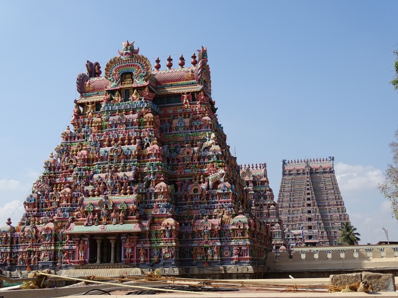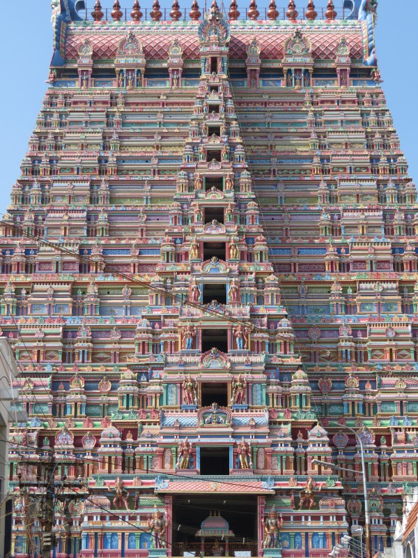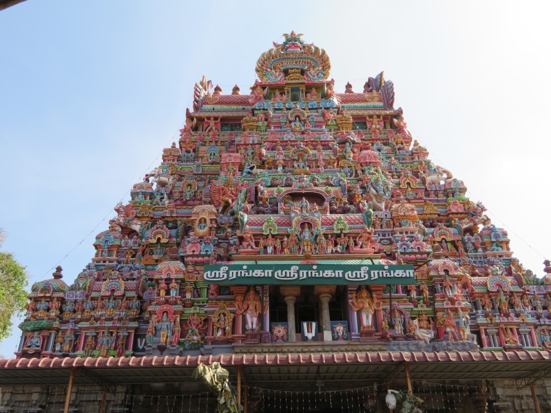 Quelle Wikipedia: „Sri Ranganathaswami-Tempel: Dieser Tempel ist wohl der größte Tempel ganz Indiens und wirklich sehenswert! Man findet ihn circa 3km nördlich des Rock Fort. Die Tempelanlage ist wirklich riesig und könnte schon fast als eine eigenständige Stadt durchgehen. Um alleine ins Innere des Tempels zu kommen, muss man zunächst sieben Gopurams durchschreiten. Der größte dieser Gopurams ist 73m hoch. Wenn man an der vierten Mauer angelangt ist, findet man hier einen Schalter, an dem man sein Ticket kaufen kann. Anschließend kann man auch die Mauer hochklettern und das gesamte Gebäude überblicken. Die Bauart soll die verschiedenen Stufen der Existenz und des Bewusstseins darstellen. Man durchläuft weitere Winkel der Anlage, trifft auf Bettler, Brahmanen, Händler und sieht Figuren von Himmelswesen und minderen Gottheiten. Am Ende kommt man in die heilige Kammer, in der schließlich Vishnu zu finden ist. Er wird hier in der Form von Sheshashayan verehrt, der auf einem Bett ruht, dass vom König der Nagas geschaffen wurde“.