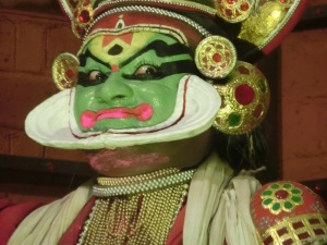 Quelle Wikipedia: „Kathakali (katha steht für Geschichte, kali für Darbietung oder Schauspiel) ist eine expressive Form des indischen Tanzes oder Tanzdramas, die vor allem im südindischen Bundesstaat Kerala gepflegt wird. Kathakali wird als eine der ältesten Tanzformen angesehen. Es ist eine spektakuläre Mischung aus Drama, Tanz, Musik und Ritual. Charaktere mit lebendig bemalten Gesichtern und aufwendigen Kostümen erzählen Geschichten ausden Hindu -Epen Mahabharata und Ramayana“.