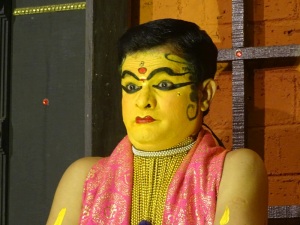 Bevor die Zweimann-Vorstellung begann, durften wir noch bei dem Bemalen der aufwendigen Gesichtszeichnungen eines Kathi zusehen. Die weibliche Rollen, (wie auf dem Foto), eine Minukku, werden traditionellerweise von Männern dargestellt. Frauen finden zunehmend Anerkennung im Kathakali.