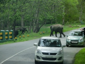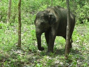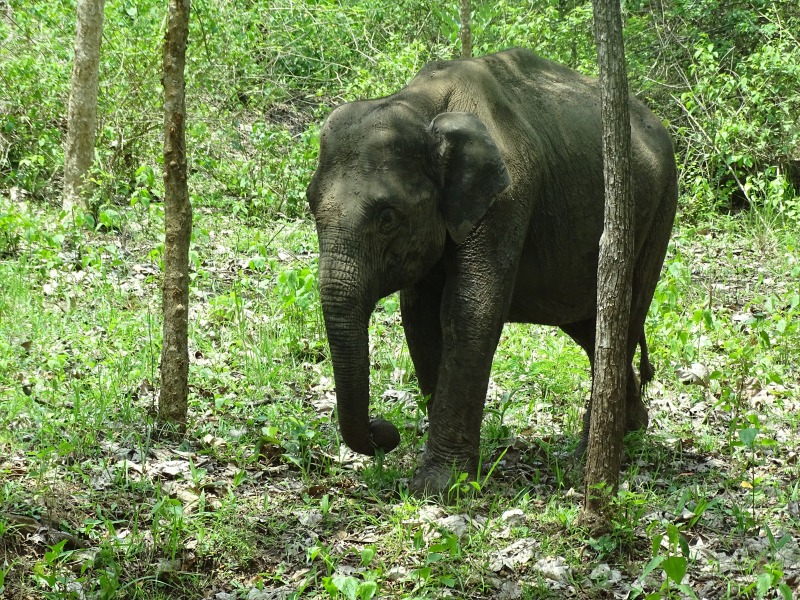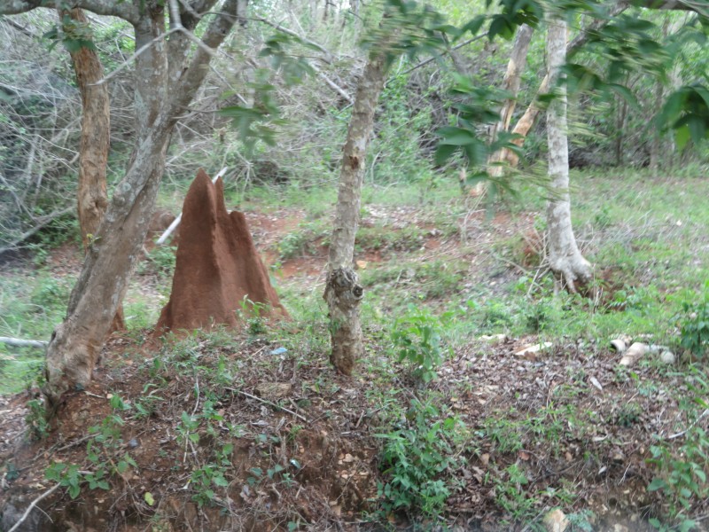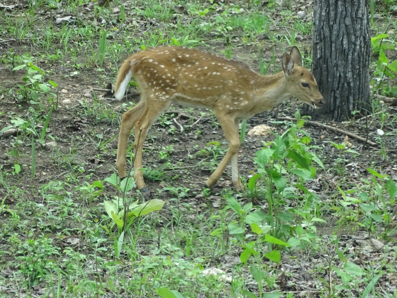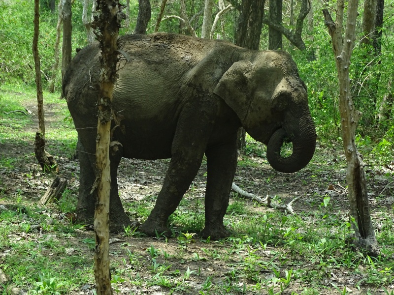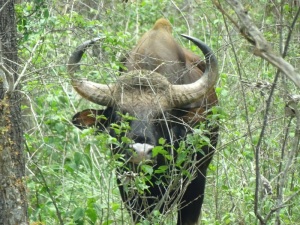 Wir haben gleich neben unserem Bus mehrere Elefanten, einen Gaur (Wildbüffel), Axishirsche und Affen. Neben der Straße gab es unzählige Termitenhügel.