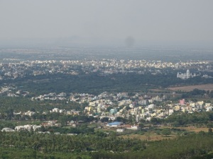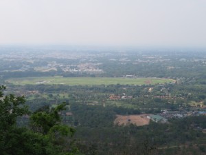 Nach dem Kaffee hielten wir nur einmal zum Fotostop auf dem Mysore Hügel. Von hier aus sah man die Stadt und den Maharadscha Palast.