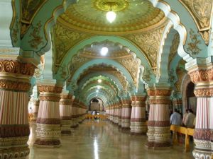 Geradezu verschwenderische Pracht – Marmor- und Mosaikböden, schwere Silber- und kunstvoll geschnitzte Holztüren, unzählige Säulen, kostspieliges Mobiliar aus aller Herren Ländern, Buntglasdekor und Spiegelwände sowie Gemälde und Wandbilder zeugen vom luxuriösen Lebenswandel der Mysore-Herrscher um die Jahrhundertwende. Die Räume sind dabei in einer verwirrenden Vielzahl an Stilen gestaltet. Besonders berühmt ist der mit Blattgold überzogene Thron in der riesigen Durbarhalle.“