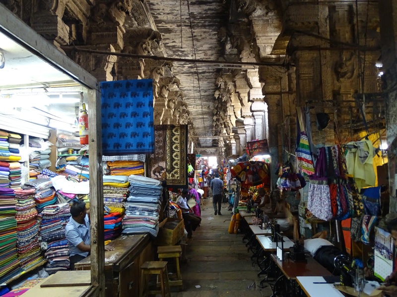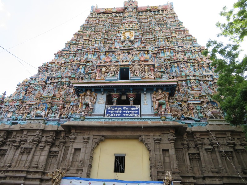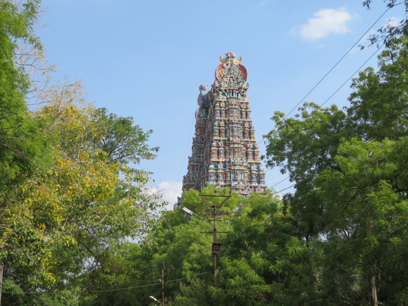 Quelle Wikipedia: „ Meenakshi-Tempel: voller Name: Sri-Minakshi-Sundareshwara-Tempel) ist ein Hindu-Tempel in der Stadt Madurai im südindischen Bundesstaat Tamil Nadu. Er ist Minakshi, der lokalen Erscheinungsform der Göttin Parvati, und Sundareshvara (Shiva) geweiht, die dem Mythos zufolge in Madurai geheiratet haben sollen. Im Gegensatz zu den meisten anderen Shiva-Tempeln steht in Madurai nicht Shiva, sondern die Göttin im Mittelpunkt der Verehrung. Die ältesten Teile des Minakshi-Tempels stammen aus der Pandya-Zeit des 12.–13. Jahrhunderts, seine heutige Gestalt erhielt der Tempel im Wesentlichen während der Nayak-Herrschaft im 16.–17. Jahrhundert. Der Minakshi-Tempel zählt zu den herausragendsten Beispielen für die dravidische Tempelarchitektur. Wie es für diesen Baustil kennzeichnend ist, hat der Tempel einen rechteckigen Grundriss und ist nach geometrischen Prinzipien aufgebaut. Der mit über sechs Hektar sehr weitläufige Tempelkomplex besteht aus drei konzentrischen Bereichen, die um die beiden Sundareshvara und Minakshi geweihten Hauptschreine herum aufgebaut sind. Im Inneren des verwinkelten Tempelkomplexes befinden sich zahlreiche weitere Bauelemente, darunter Korridore, mehrere große Säulenhallen und ein Tempelteich. Die zwölf hoch aufragenden Gopurams (Tortürme) des Tempels sind mit üppigem und bunt bemaltem Figurenschmuck ausgestattet und beherrschen weithin sichtbar das Stadtbild Madurais. Auch der Stadtgrundriss Madurais richtet sich nach dem Minakshi-Tempel, welcher den Mittelpunkt der Altstadt bildet und von mehreren konzentrischen Ringstraßen umgeben wird“.
