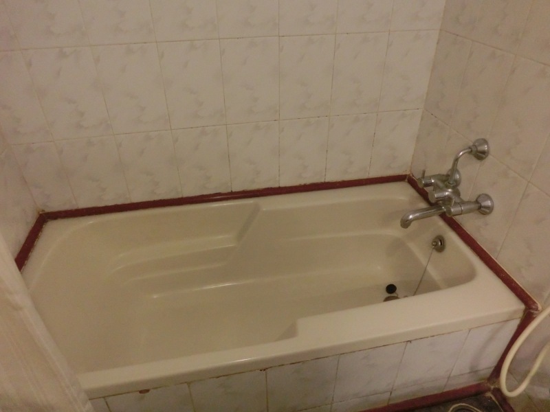Hier passt das Sprichwort: “Außen hui, innen pfui“. Im Zimmer vor allem im Bad sah es schon sehr schlimm aus. Hier nagte der Zahn der Zeit, Fliesen kaputt, Fugen z.T. kaputt und über dem Wannenrand Schimmel.